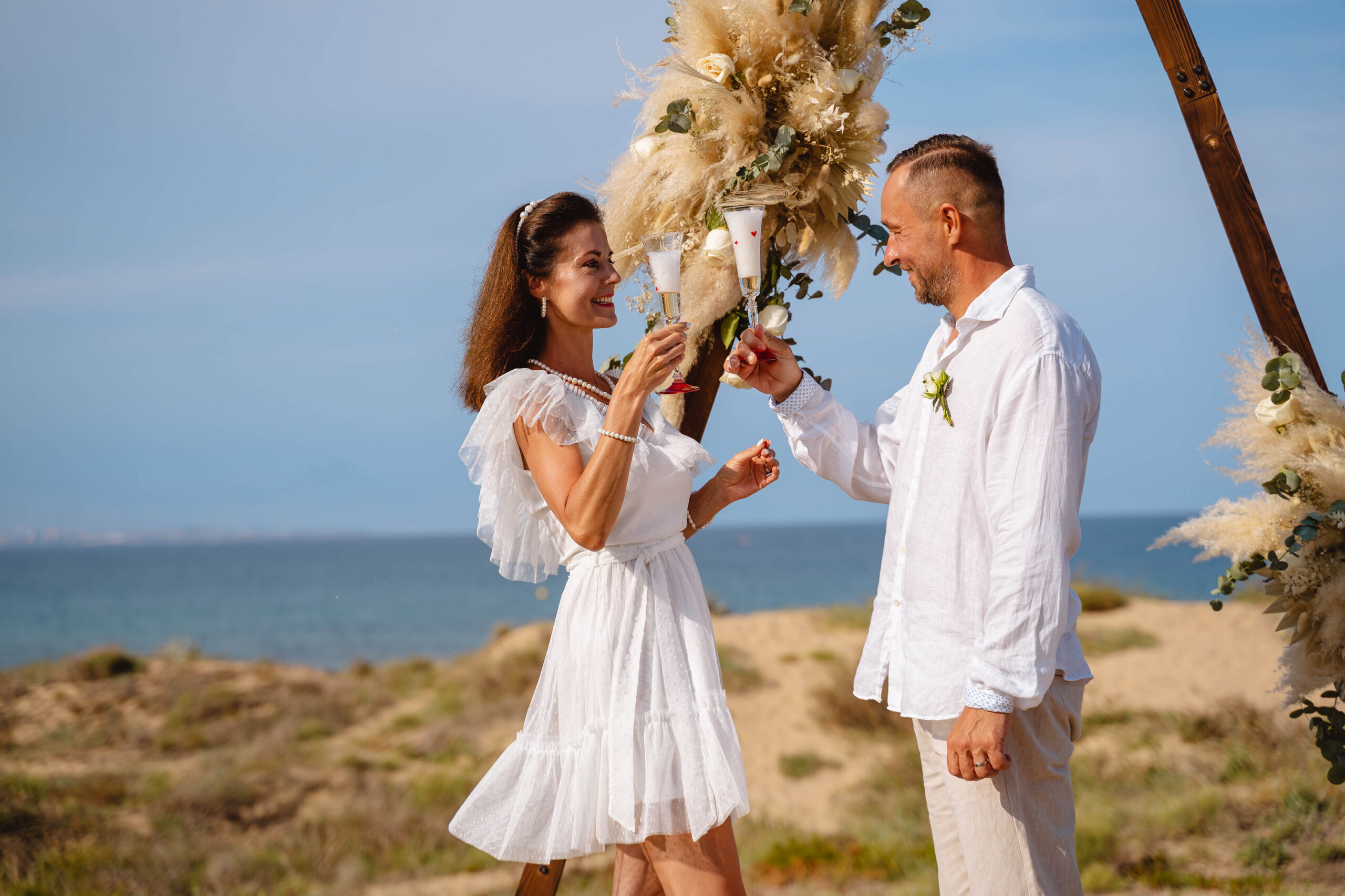 Are you looking for a destination wedding abroad or elopement in sunny Spain? Here are some tips from the amazing wedding officiant Marcia Bravo, wedding celebrant in Malaga, Costa, del Sol. Marcia did a sandy wedding ceremony ritual for this beautiful couple, it has perfectly matched the location of this elopement.